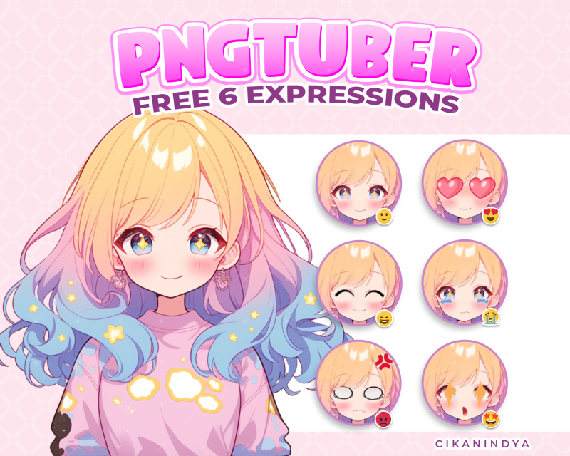 PNG Tuber | Blonde Pink Blue Gradient Hair Girl with Star Accessories | Get 6 Poses | Fashionable Chibi | Pngtuber Model | Streaming