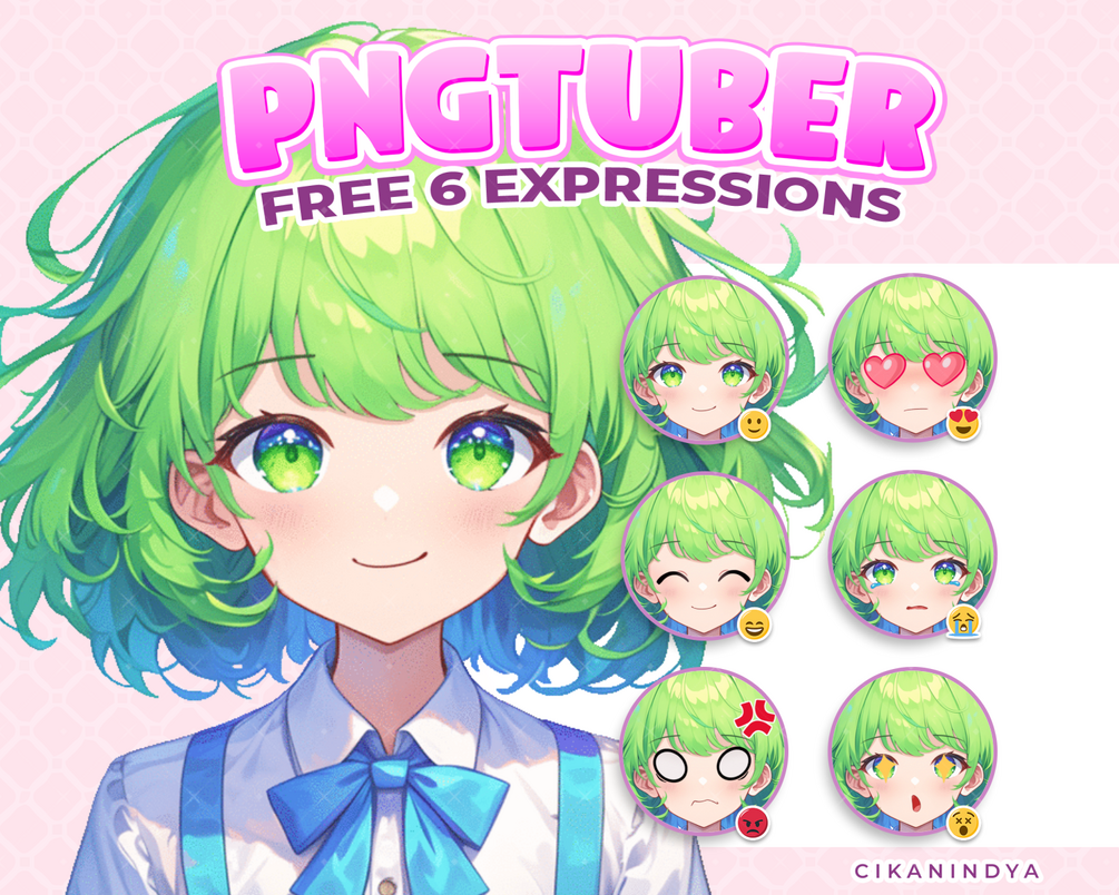 PNG Tuber | Bright Neon Green Hair Girl with Large Blue Bow Tie | Get 6 Poses | Vtuber | Pngtuber Premade | Streaming